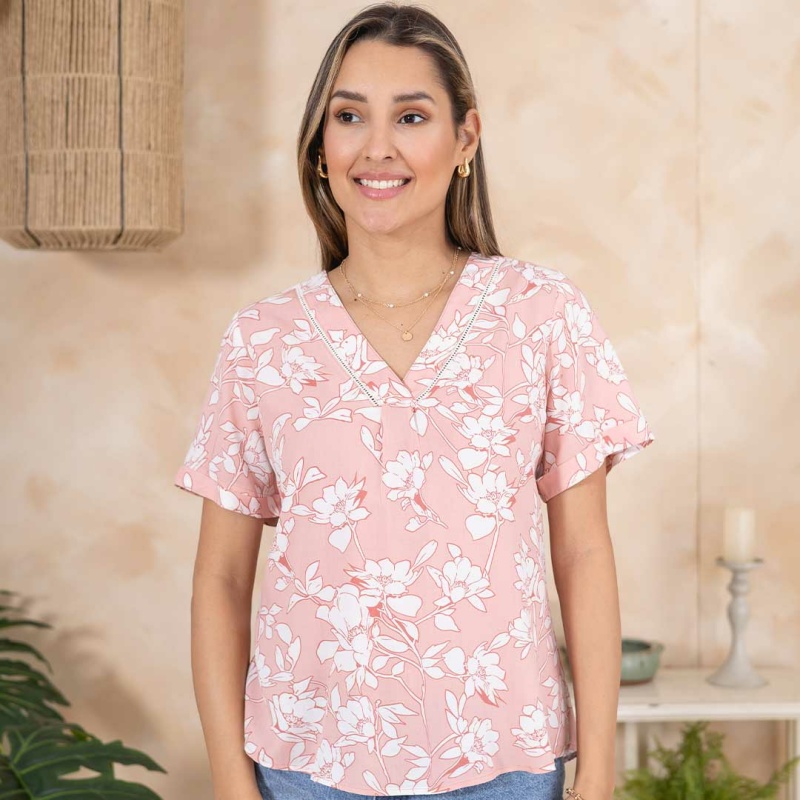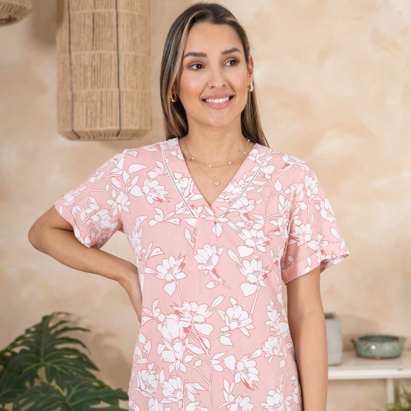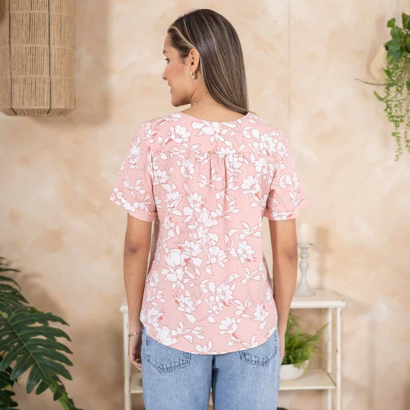 Esta blusa de mangas cortas en color rosa estampado es la elección perfecta para un look fresco, femenino y elegante la blusa se destaca por su suavidad y caída fluida, lo que la convierte en una prenda cómoda y ligera, ideal para el día a día o para ocasiones especiales durante el verano.