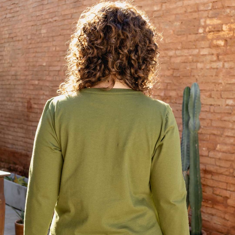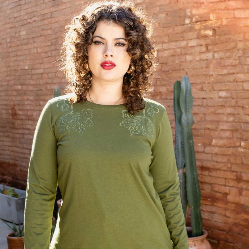 Esta remera de mangas largas es una prenda que combina comodidad y estilo con un toque de elegancia artesanal. El diseño se distingue por sus detalles bordados cerca del hombro, que aportan un elemento decorativo sutil pero distintivo, las mangas largas ofrecen una cobertura completa y hacen de esta remera una opción ideal para climas más frescos o para el uso durante todo el año.