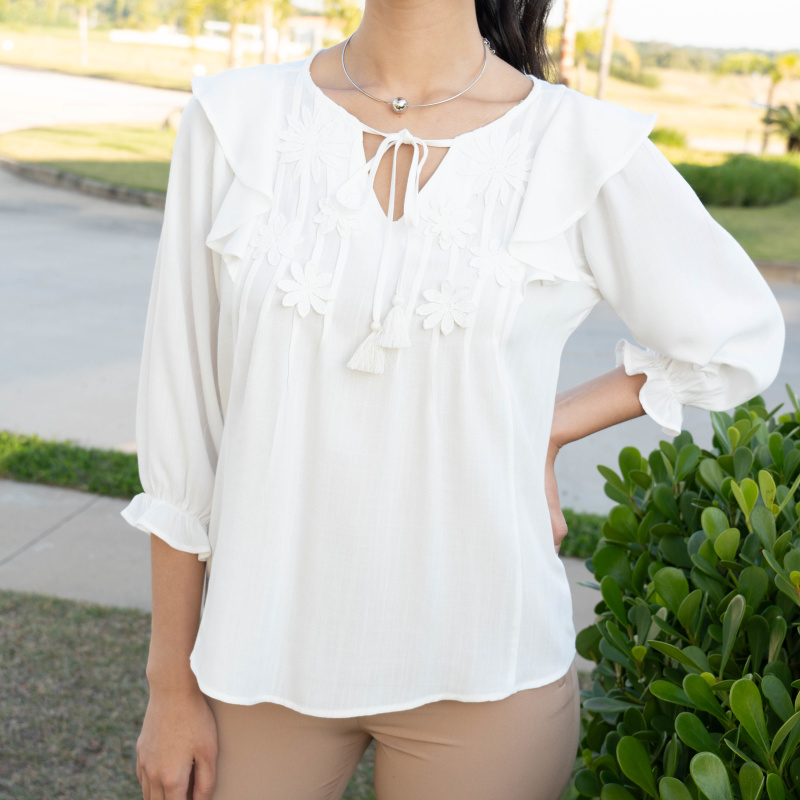 Es una pieza refinada que combina elegancia y estilo. Los detalles en volados y apliques florales aportan un toque romántico y decorativo. Versátil y sofisticada, esta blusa es adecuada para una variedad de ocasiones y estilos.