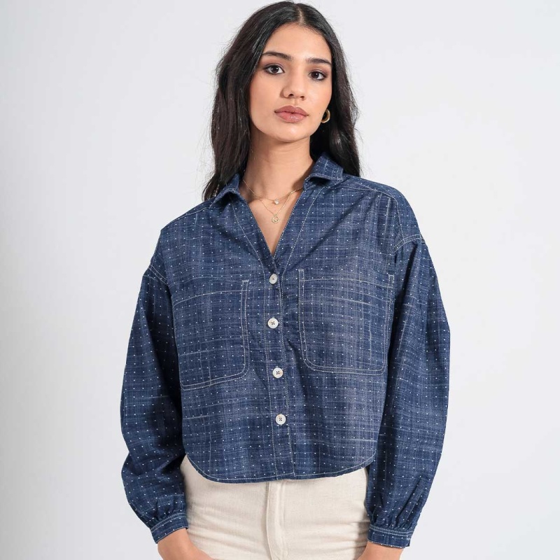 La camisa cropped de mangas largas en color azul con motas blancas es una prenda que combina el estilo moderno con un toque retro, perfecta para quienes buscan una mezcla de elegancia y frescura. Esta camisa no solo destaca por su diseño único, sino también por su comodidad y versatilidad, convirtiéndola en un elemento esencial para diversas ocasiones.