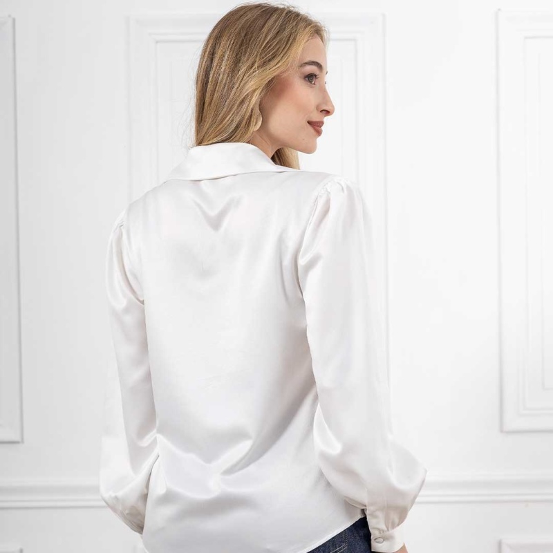 La camisa presenta un corte clásico de mangas largas, con un ajuste que proporciona una silueta favorecedora sin ser demasiado ajustada. La verdadera distinción de esta prenda radica en sus mangas abullonadas, que añaden un toque de sofisticación y volumen a la camisa.