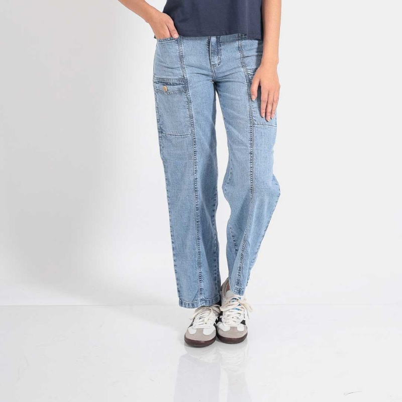 El denim claro del pantal贸n proporciona un aspecto fresco y casual. El tono claro es vers谩til y f谩cil de combinar con una variedad de colores y estilos, ideal para un look informal y veraniego.