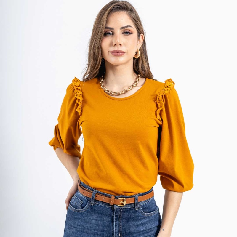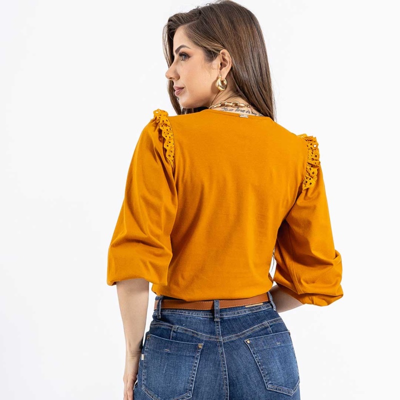 Detalles: La remera tiene detalles de volantes en los hombros, añadiendo un toque femenino y elegante.