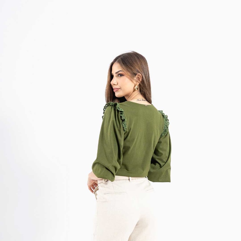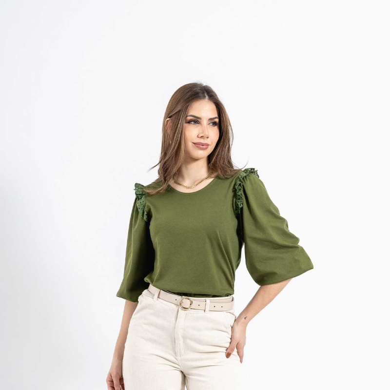 Detalles en los hombros: Los hombros están adornados con volantes de encaje, un detalle delicado que agrega un toque femenino y romántico a la prenda. Este adorno eleva el estilo de la remera, haciéndola apropiada tanto para ocasiones casuales como para eventos más formales.